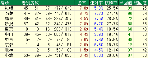 • 考察: 複勝回収値58が示す通り、人気馬でも3着内を外すケースが目立ちます。