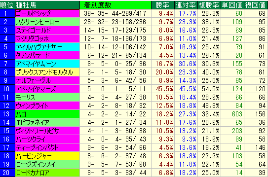 • 1位:ヴィクトワールピサ 複勝率は21.1%と目立ちませんが、単勝回収値は「203」。平均より勝率は高く、人気薄でもアタマ(1着)まで突き抜ける爆発力を秘めています。