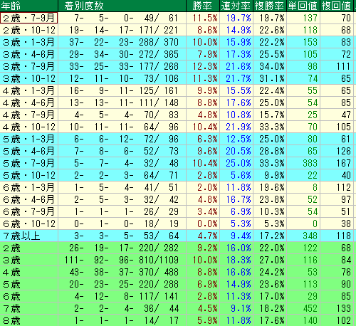 - 4歳(7-9月):複勝率 15.7% / 複勝回収値 47 要注意なのが「4歳の夏」です。他の時期に比べてパフォーマンスが半分近くまで激減します。充実期と思われがちな4歳夏ですが、和生騎手に関しては「消し」の判断も必要になる地雷ゾーンです。