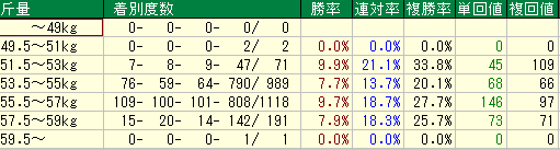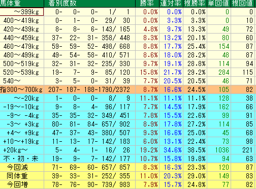 - 同体重:勝率 11.0% / 複勝率 29.0% / 単勝回収値 149 仕上がりが安定している「同体重」の時、的中率・回収率ともに非常に高いレベルでまとまっています。軸としての信頼度はここがNO.1です。