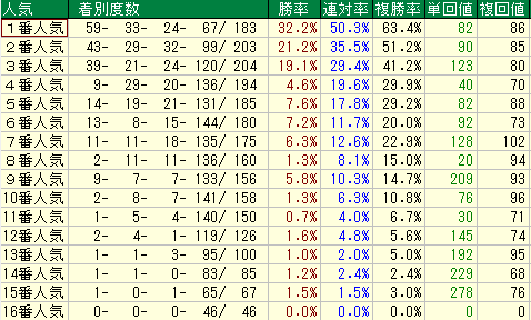 - 解説: 平均をわずかに下回る的中率。悪くはないものの、他の中長距離に比べると妙味はガクンと落ちます。