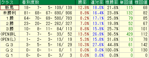 - 勝率 6.9%(平均 7.0%) / 複勝回収値 59(平均 75)
