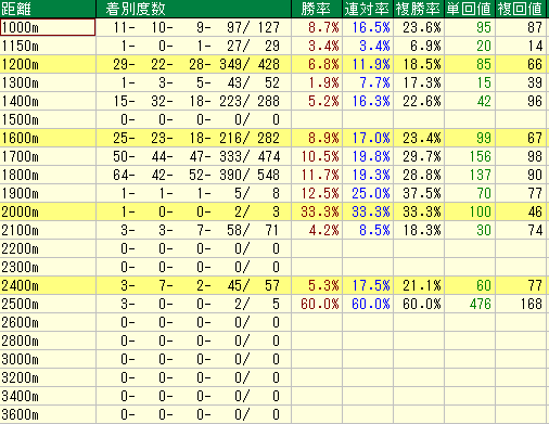 - 1600m以下: 1000mの直線競馬などはこなしますが、全体的に回収率は低調。人気を背負った際の信頼度はそこまで高くありません。