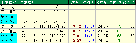 | 馬場状態 | 複勝率 | 単勝回収値 | 複勝回収値 | 評価 |