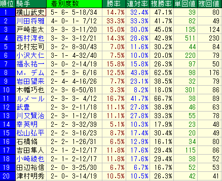 - 勝率7.0%、連対率14.1%、複勝率21.1%と、勝率と連対率が最も高くなります。単勝回収値139と回収率も高く、この時期に勝ち切る力が最も増します。
