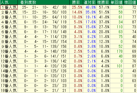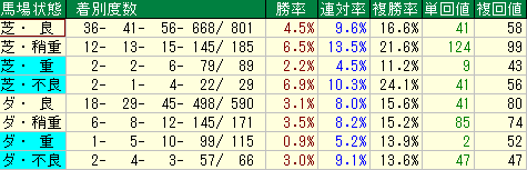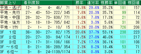 - 【苦手枠】内番(1番~4番)と外番(13番~18番)は平均以下。特に大外枠は極めて苦手で、好走は期待薄。