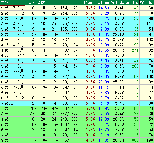- 4歳・10-12月、5歳・7-9月、6歳全体は、好走率が低下し、馬券的に厳しい時期と言えるでしょう