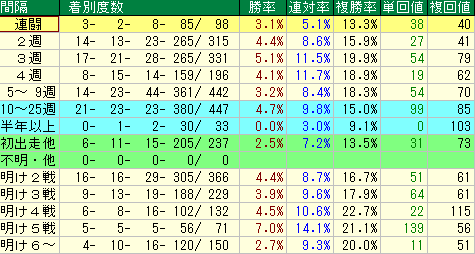 - 3週は勝率5.1%、複勝率19.9%。4週は勝率4.1%、複勝率18.9%と、この辺りからパフォーマンスが上昇し安定します。馬が適度にリフレッシュし、かつレース勘も保たれている状態と言えるでしょう。