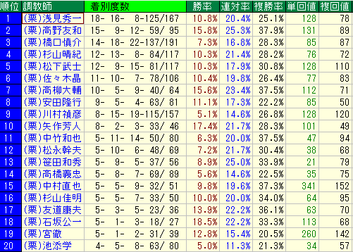 • 第1位:高野友和厩舎(栗) 複勝率が驚異の 37.9% を誇り、さらには単勝回収値 131、複勝回収値 89 と文句なしのトップ評価です!勝率も 15.8% と高く、ただ持ってくるだけでなく「勝ち切る」信頼感は他の追随を許しません!