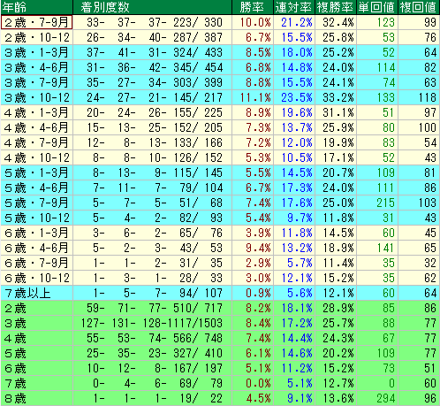 回収率を重視するなら、「5歳夏の単勝(回収値215)」 を狙い撃ちするのがプロの買い方。 一方で、6歳以降の高齢馬 については、複勝回収値が 51 以下に落ち込むケースが多く、基本的には「消し」の判断で期待値を高めることができます。