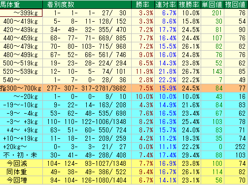 一方で、500kg前半の馬格大幅なプラス体重(+4kg以上) での出走は、人気に対してパフォーマンスが伴わないことが多く、回収率を下げる「D評価」の罠となります。