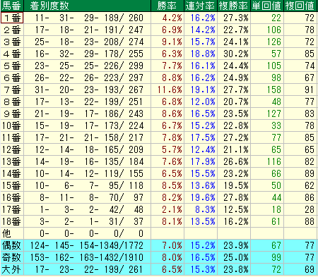 • 奇数番:複勝率 25.0% / 単勝回収値 99 / 複勝回収値 77