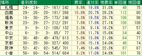 • 複勝率は平均以上(24.9%)ですが、勝ち切る効率が極めて悪く、単勝での妙味はありません。