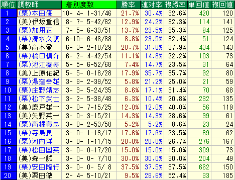 - 的中率:19.5% / 単勝回収値:80 / 複勝回収値:74