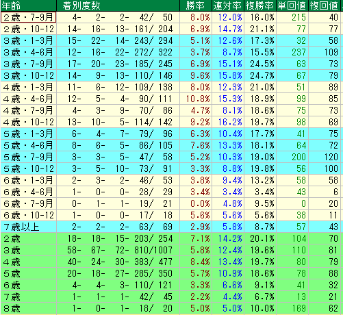 - 4歳全体:【勝率8.4%の信頼感】 最も勝ち切る確率が高いのが4歳馬です。4〜6月期には勝率**10.8%**という二桁の数値を記録。馬の能力をきっちり引き出し、人気相応〜人気以上の着順に持ってくる安定感があります。馬券の軸として最も計算が立つ年齢帯です。