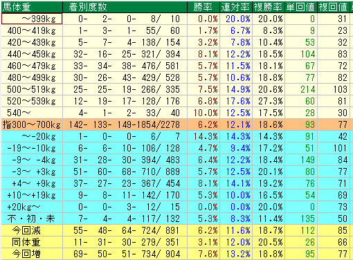 - 440kg未満はどれほど実績があっても「軽視」! 的中率・回収率ともに低く、砂の深いダート戦では苦戦が必至です。人気馬であっても、この体重なら疑ってかかるのが収支を安定させるコツです。