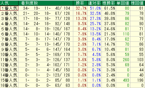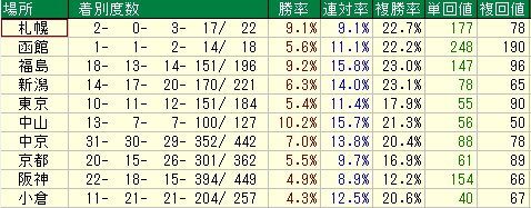 単勝回収値42、複勝回収値64。複勝率は35%とそこそこありますが、回収率の低さが致命的です。「人気馬で2、3着に来るが、勝てないし配当妙味もない」という、馬券師泣かせの組み合わせです。