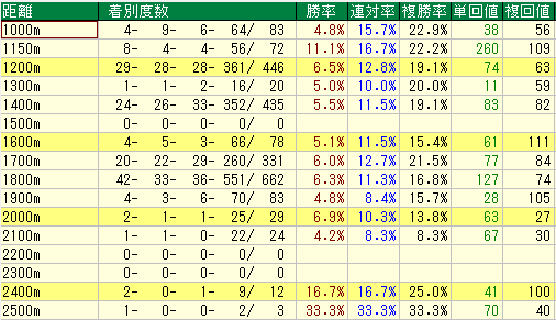 - 長距離戦の極端な傾向 2100m付近では壊滅的な不振を見せていますが、さらに長い2400m以上になると勝率が跳ね上がるなど、距離によって得意不得意が非常に激しいのが特徴です。
