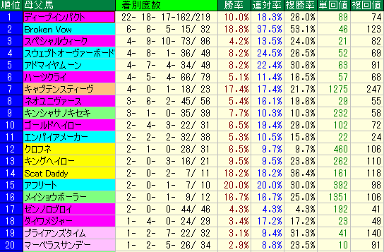- 第2位:Scat Daddy 複勝率36.4%、単勝回収値161、複勝回収値118。全項目が100超えという、非の打ち所がない完璧なデータ。米国のスピード血統がラブリーデイの粘り強さと見事に融合し、常に高い期待値をキープする超エリート配合です。