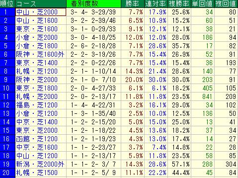 - 第3位:キンシャサノキセキ 複勝率10.3%、複勝回収値58。短距離のスピードを期待して買うと、ラブリーデイの持続力と喧嘩してしまい、どっちつかずの結果に終わるパターンが非常に多いです。