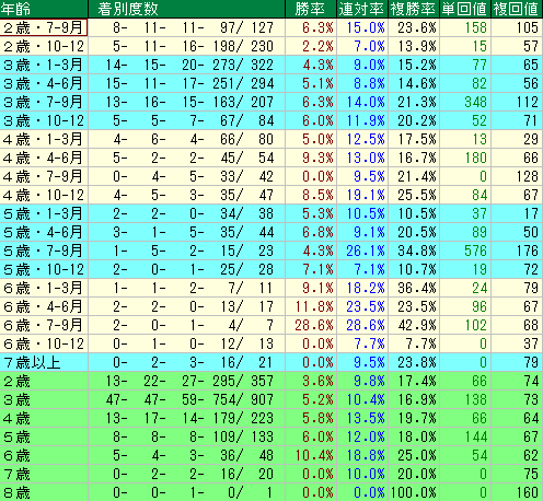 - 【評価:D】2歳(10-12月) & 5歳(1-3月) 2歳末の勝率は2.2%、5歳頭の複勝回収値は17。成長の踊り場(停滞期)に当たりやすく、過剰人気になりやすい時期のため注意が必要です。
