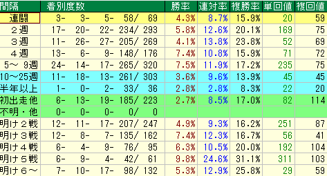 1.レース間隔別パフォーマンス:狙い目は「中1週」と「中4〜8週」!