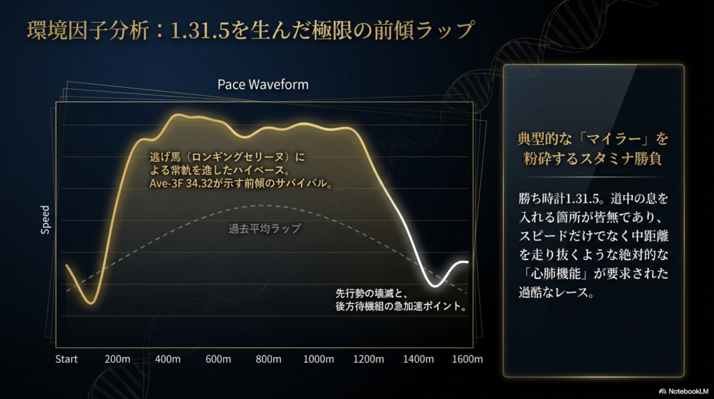ハナを切った8番ロンギングセリーヌのPCIは、なんと**「42.0」**。 これは、マイル戦としては「暴走」に近いほどの極めて低い数値です。さらに、ロンギングセリーヌに競りかけていった18番プレセピオ(PCI 44.7)や、9番ルールザウェイヴ(PCI 45.9)も、軒並み40台半ばという限界突破の数値を叩き出しています。