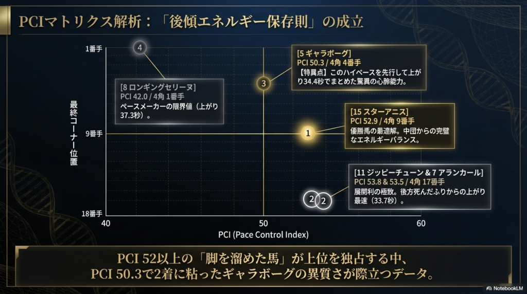 展開に恵まれたスターアニスとは異なり、ギャラボーグは**「自分から勝ちに行き、最も苦しい競馬をして2着に残した」**のです。前目のポジションで上位に残ったのは、この馬と4着アイニードユー(通過順4-4、PCI 49.3)のみ。スローペースの瞬発力勝負しか経験がなかった馬が、G1のタフなハイペースを好位で凌ぎ切ったという事実は、ギャラボーグのポテンシャルと地力が世代を超越していることを強く証明しています。