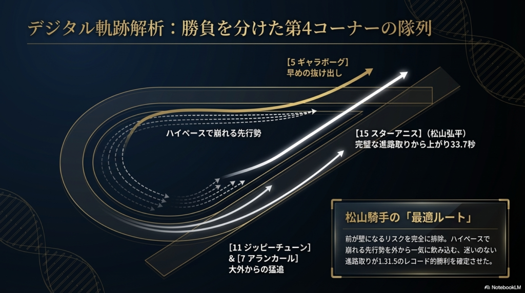 前が玉砕覚悟のハイペースで飛ばす中、展開の利を最大限に享受していたのが中団から後方に控えた馬たちです。 15番スターアニスは、この激流に巻き込まれることなく通過順「9-9」の馬群の中団でじっと息を潜めていました。さらに後方、通過順「17-17」の最後方には11番ジッピーチューンと7番アランカールが待機。彼らは前の潰し合いを冷静に見据え、直線の末脚に全てを賭ける態勢を整えていました。