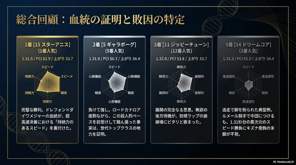今回のレースは、明確に「ハイペースによる差し・追込決着」でした。しかし、個別のデータを見ると、単なる展開待ちではない、各馬の「真の能力」が見えてきます。
