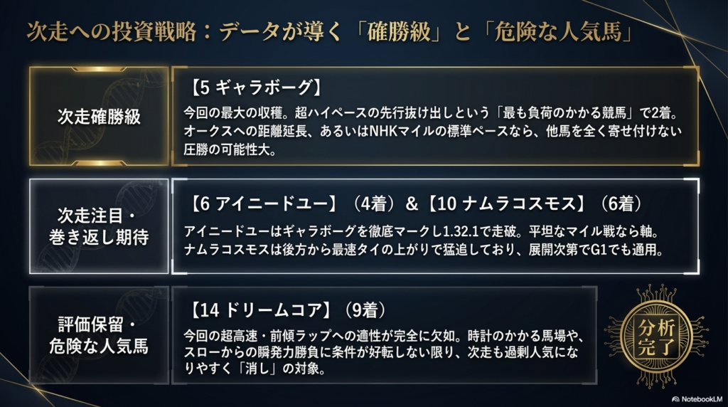 ギャラボーグ(今回2着) 今回、最も強い競馬をしたのは間違いなくこの馬です。「スローの上がり勝負」だけでなく「ハイペースの好位抜け出し」にも対応できることを証明し、弱点らしい弱点がなくなりました。距離が延びるオークス(2400m)でも、この自在性と心肺機能の高さは圧倒的な武器になります。次走の主役はこの馬で決まりです。