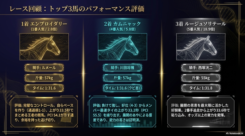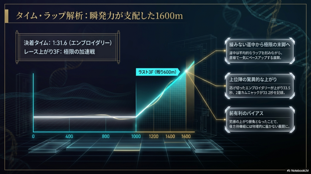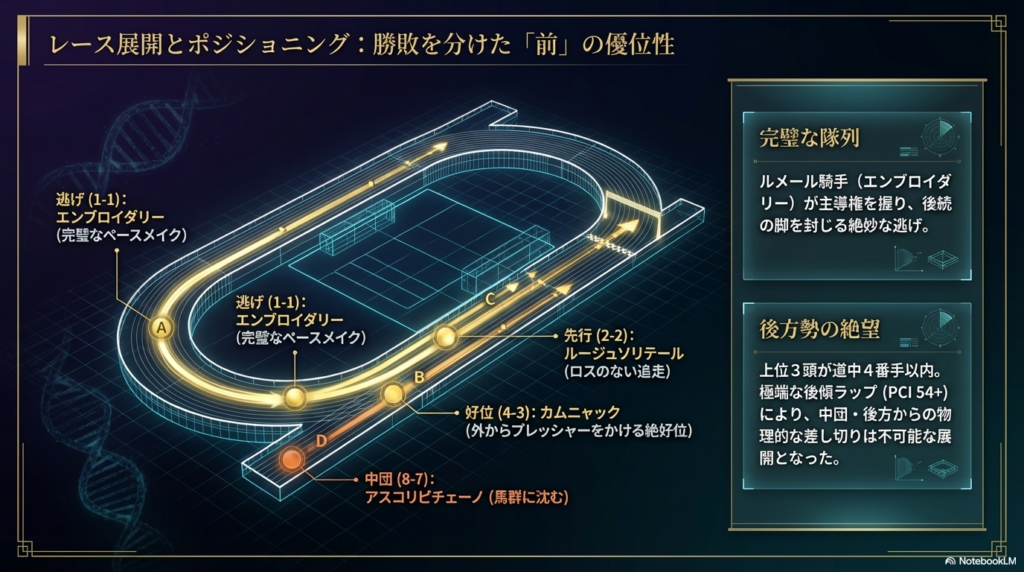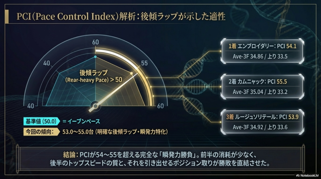このエンブロイダリーが作ったPCI 54.1という絶妙なペース配分こそが、今回のレースの全てを決定づけました。「前に行ってもバテない」「後ろからでは物理的に届かない」という残酷な状況を、逃げ馬自身がコントロールして作り出していたのです。