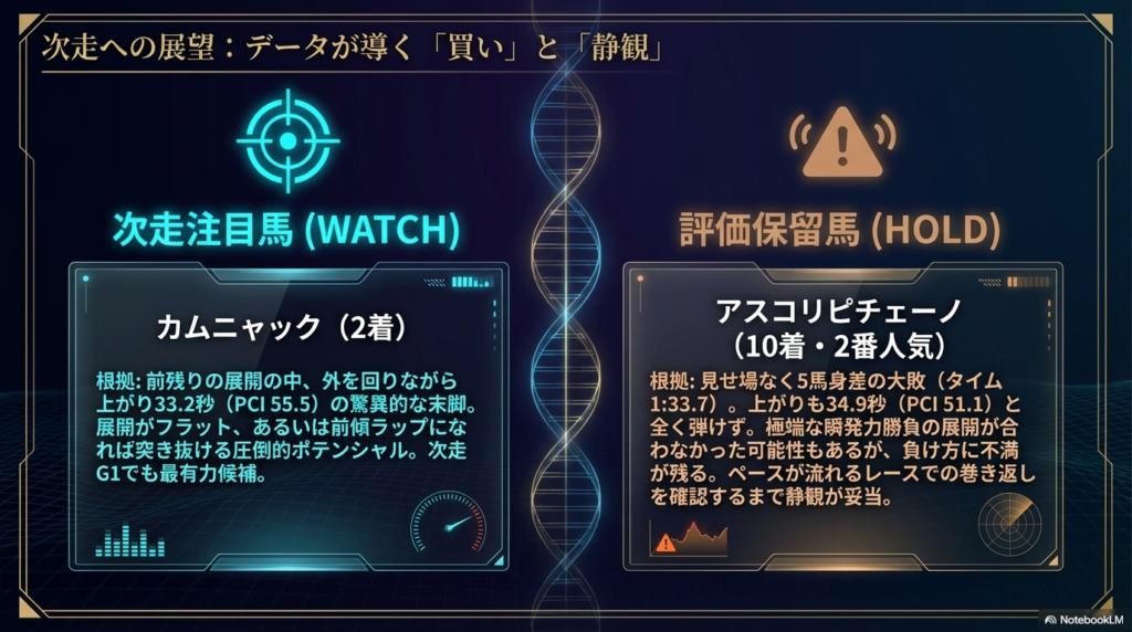 アスコリピチェーノ(10着) 今回は「極端な瞬発力勝負」という明確な敗因(適性外)があるため、この一戦だけで能力に見切りをつける必要はありません。ペースが流れるタフな持続力戦になれば、一変する可能性は十分にあります。 しかし、「スローペースからの上がり勝負には極端に脆い」という弱点が露呈したのも事実です。次走、再び瞬発力が問われるコースや、スローペースが見込まれるメンバー構成になった場合は、人気を集めても「危険な人気馬」として疑ってかかる勇気が必要になります。展開を読み切れるかどうかが、この馬の取捨の鍵を握ります。
