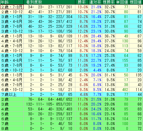 • **5歳後半(10-12月)**になると、**勝率2.9%、複勝率8.8%**と大きく成績が下降します。この時期は注意が必要です。