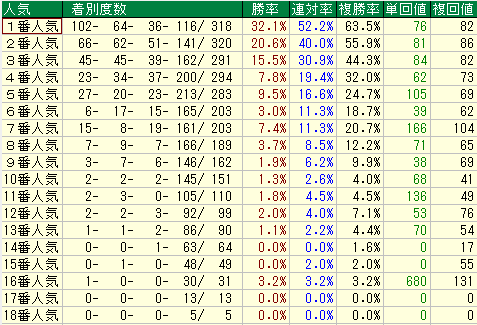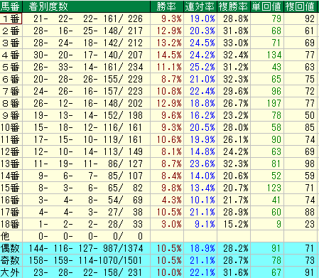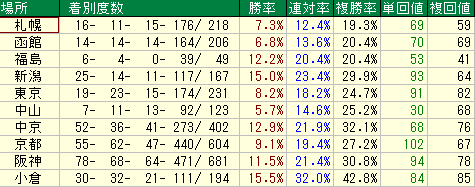 • 単勝回収値69、複勝回収値65と、回収値も平均レベルです。