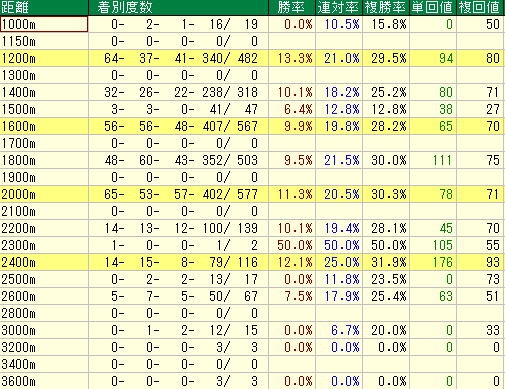 1. 2400m (複勝率31.9% / 単勝回収値176 / 複勝回収値93) – 最強の得意距離!