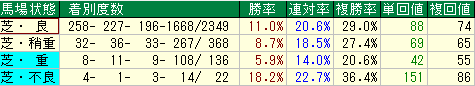 • 芝・不良馬場 (複勝率36.4% / 単勝回収値151 / 複勝回収値86)