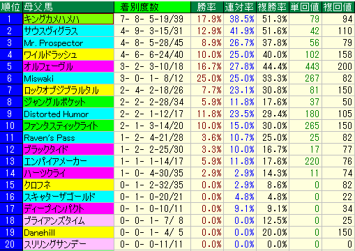 - 母父 スリリングサンデー 複勝率・回収率ともに 0% 。現状、この組み合わせで勝負するのは無謀と言わざるを得ません。