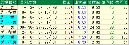 コース形態と馬場コンディションの相性により、特定のコースで異常な強さを発揮します。