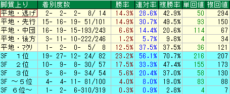 - ベスト戦略:「先行」。上がり3Fが2位や3位であっても、ポジションの利で複勝回収値 150 を叩き出します。