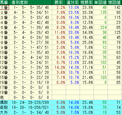 - 複勝回収値:74 回収率こそ微増しますが、勝率・連対率・複勝率すべてにおいて偶数番に一歩譲ります。軸としての信頼度は偶数番が上です。