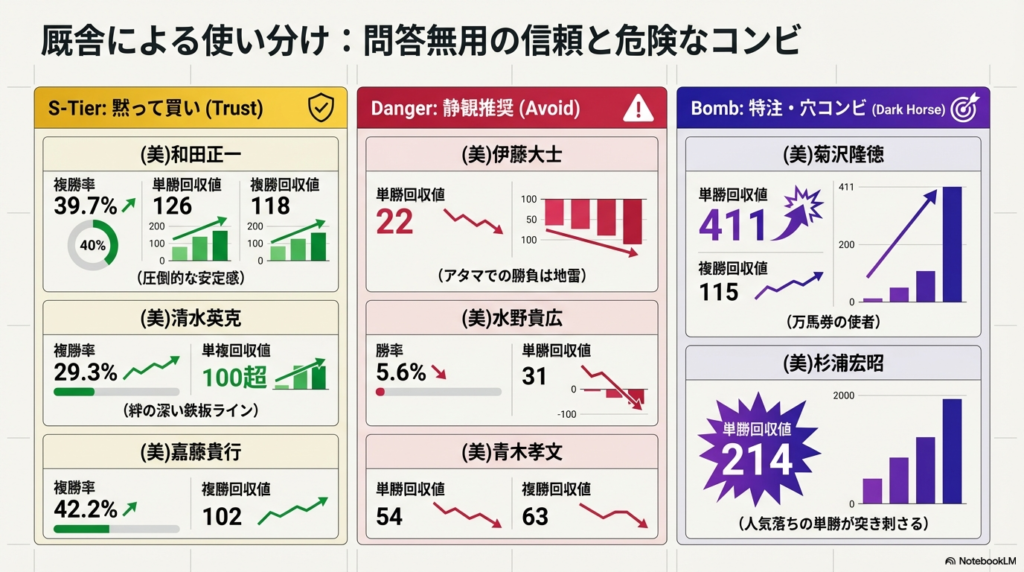 過去10年のデータで暴く!芝の丹内騎手「真の買い条件」とは? 騎手特徴 2026.04.09 詳しくはここから 丹内祐次騎手特徴 芝編騎手データ(2016年~2025年)調教師丹内祐次×調教師:問答無用の信頼を誇る最強神コンビBEST5丹内騎手の技術を最大限に引き出し、的中率・回収率ともに最高峰のパフォーマンスを見せる**「稼ぎ頭」**たちがこちらです!第1位:(美)和田...