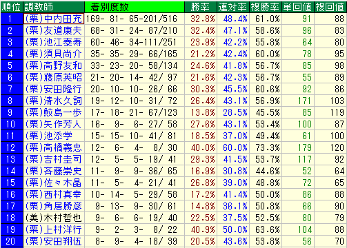 - (栗) 安田翔伍調教師 複勝率53.8%と複勝率自体は悪くないものの、単勝回収値56、複勝回収値70と、回収値が低迷しています。人気で堅実に連に絡むものの、オッズ妙味が薄いパターンと言えます。