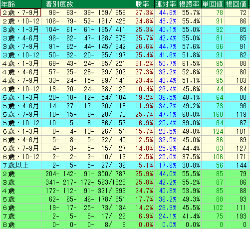 - 警戒期間:4歳・10-12月は、全体的に成績が落ち込むため、軸の信頼度を一段階下げる必要があります。