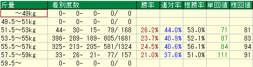 さらに注目すべきは、複勝回収値も94と優秀であること。これは、高い複勝率を維持しつつも、人気通りに収まらず、しっかりと妙味も確保していることを意味します。安定性と回収率を両立した、最もバランスの取れた最強のゾーンが、この55.5kg~57kgなのです。