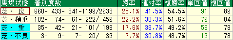 | 馬場状態 | 複勝率 | 単勝回収値 | 複勝回収値 | プロの評価 |