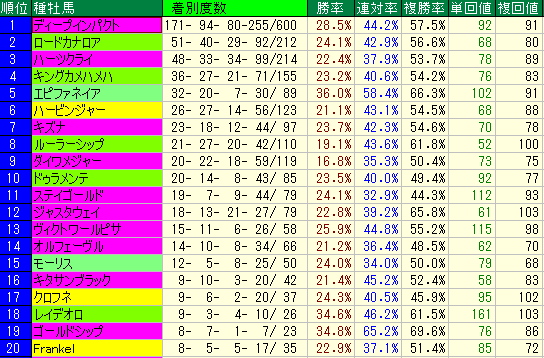 - 第3位:ドゥラメンテ 複勝率49.4%、単勝回収値92。 複勝率が5割を下回りながら、単勝回収値は90台をキープ。ディープインパクト産駒などと比べ、人気が少し落ちたタイミングで勝ち切る傾向があります。