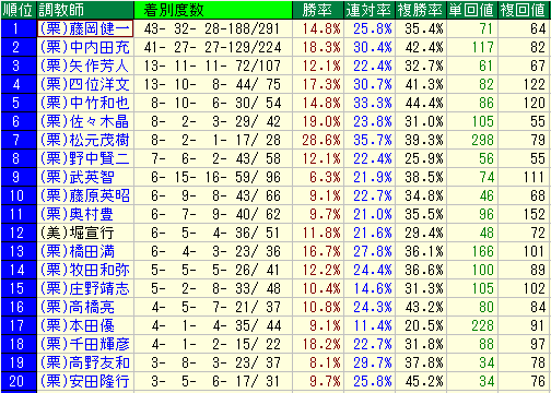 • ブロガー評価: 分母が最も大きい中、複勝率3割をキープしているのは立派。藤岡騎手の実力を素直に反映した数字であり、平均より高い期待値を持っています。