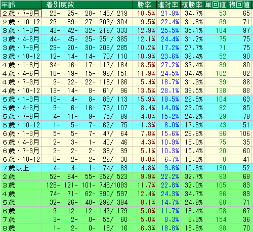 5歳以上の7-12月期にかけては、勝率・回収率ともに極端に低い数字が並びます。この時期の高齢馬への騎乗は、人気馬であっても疑ってかかるのが賢明な判断です。