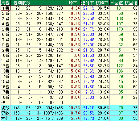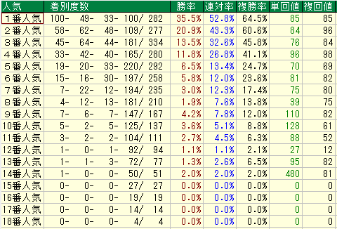 • 複勝率 39.8% / 単勝回収値 84 / 複勝回収値 98